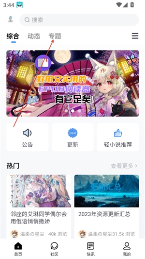 5、进入首页后,在上方导航栏点击“专题”选项,进入专题页面中。