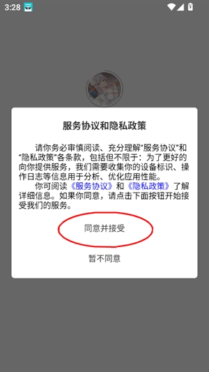 1、打开尘缘轻水app,同意并接受相关条款和隐私政策。