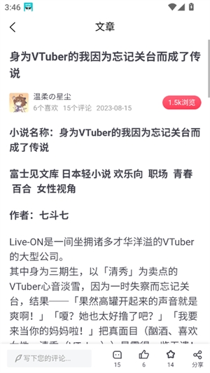2、社区与资讯功能:用户可以讨论轻小说剧情,分享心得,资讯功能则帮助用户了解日本轻小说的最新更新时间。