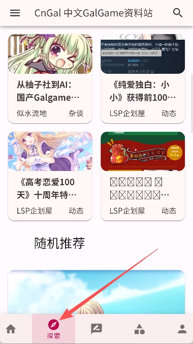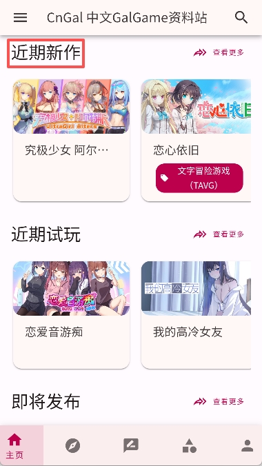 1.打开软件进入到主界面中。,在首页我们能浏览近期最新更新的galgame