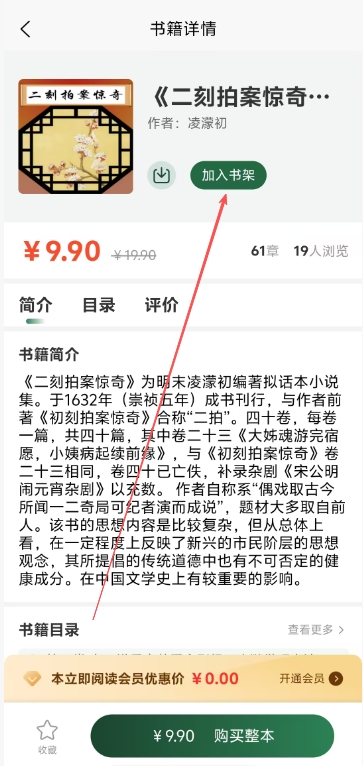2.之后在书籍详情页面中,还能查看书籍简介、目录和评价等内容,点击加入书架即可。