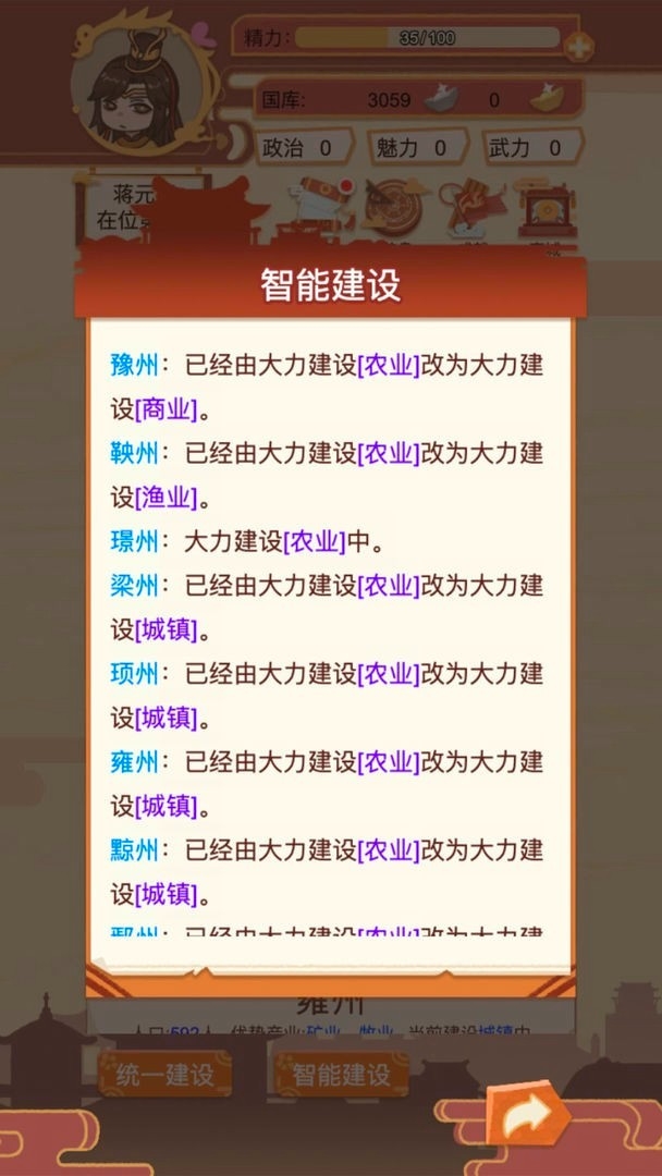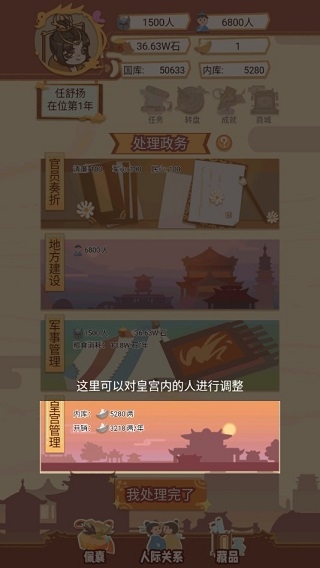 之后点击返回,了解了官员奏折之后,下面便是其他政务的处理事项,其中地方建设影响国家税收收入,在军事管理中可以培养军队,也可以率军出征,扩张领地。当然啦你也可以对皇宫内的人进行调整。