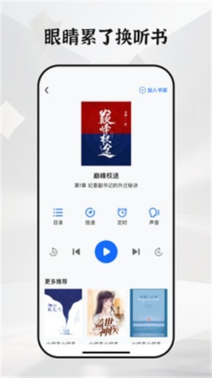 2、个性化听书设置与书架管理:支持语速调节、定时关闭、背景音叠加、AI语音切换,并提供书架分类、收听历史及进度同步功能。