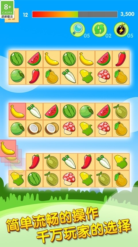 4、游戏以三消为主题,通过轻划屏幕,交换水果位置。