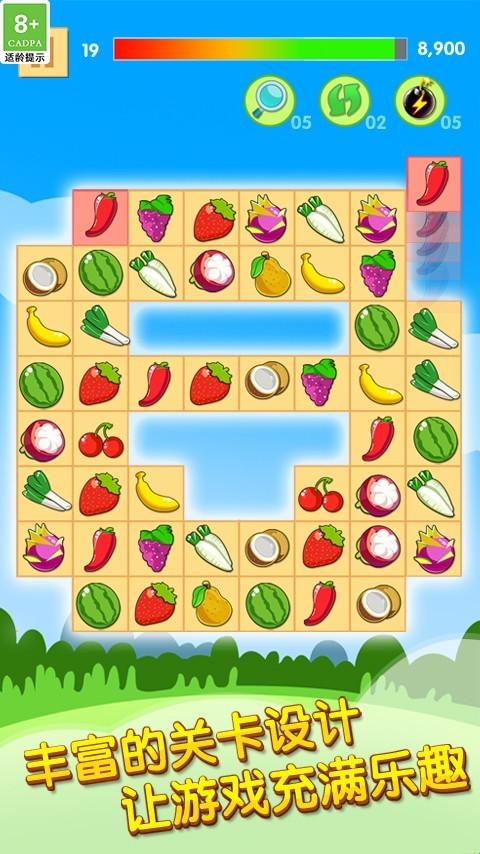 1、轻松的趣味消除,丰富有趣的消除关卡,个性化的水果主题背景,自由切换不同的模式。