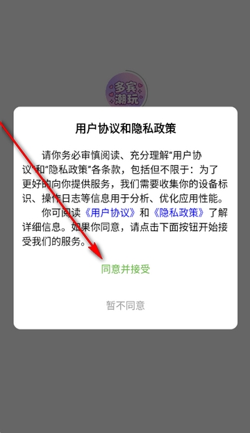 1、打卡多宾潮玩app,点击同意隐私政策