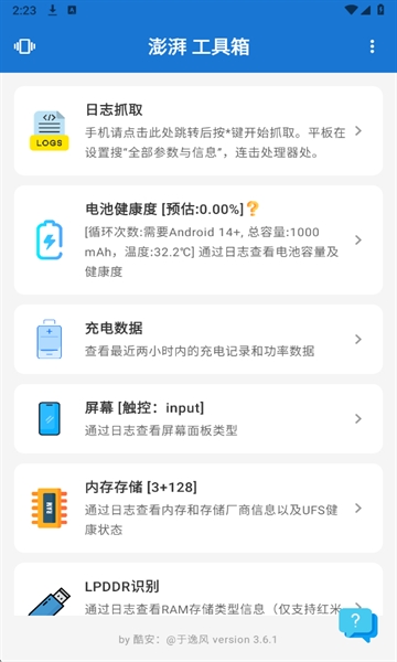 1、手机状态全面掌握:从电池健康到充电数据,从内存使用到存储空间,从屏幕状态到系统日志,澎湃工具箱帮助用户全面了解手机各项关键指标。