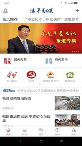 2、开设多样的首页资讯展区,这里有国内和省内时政,还有学习强国、党建以及文明实践中心等专区