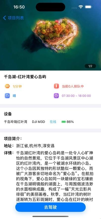 2、飞行准备:选择心仪的飞行点位,点击进入点位详情界面。在详情界面同网页版可查看收费标准、占用情况、营业时间天气情况、无人机目前电量等信息。