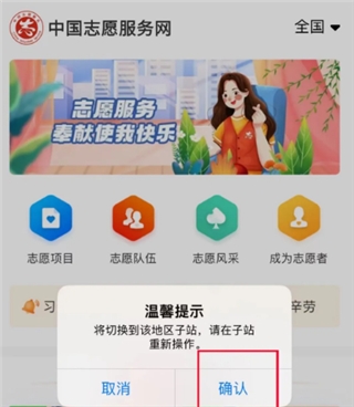 3、登入成功之后可以点击首页的志愿项目,大家可以现在自己想要参加的项目,首先可以先选择一下地区。