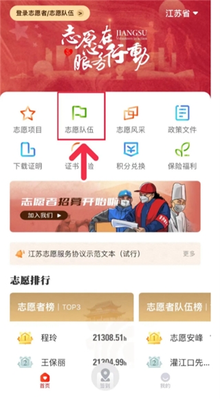 4、登录成功后,点击首页中的在“志愿队伍”。
