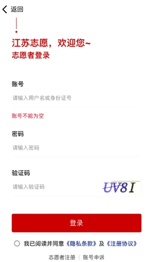 3、进入登录页面后,首次登录的同学需进行志愿者注册,注意需填写真实资料(需要进行身份验证)。若注册时显示账号已存在或忘记密码,请点击“账号申诉”。