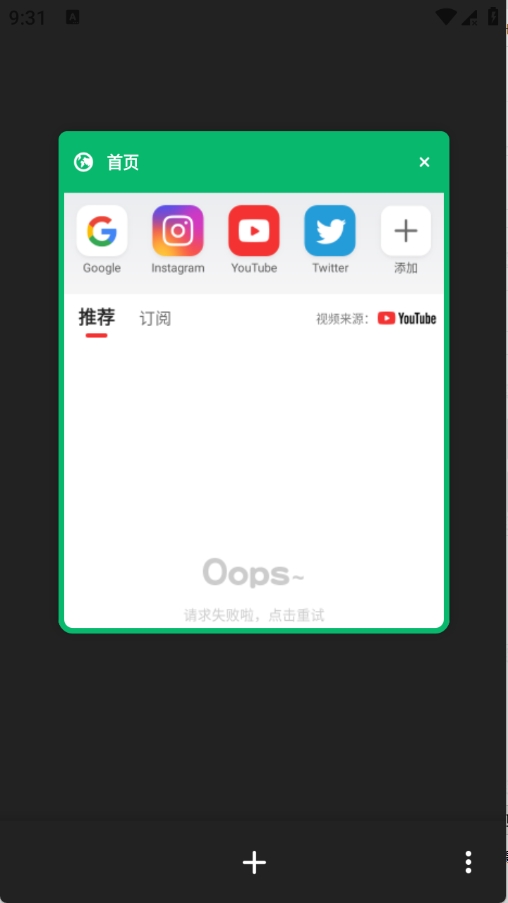 2、进入浏览器后,点击屏幕中间的绿色按钮。