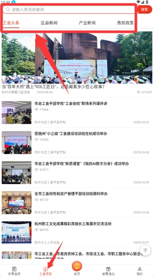 2、在工会资讯页通过搜索或头条分类,查找感兴趣的新闻内容。