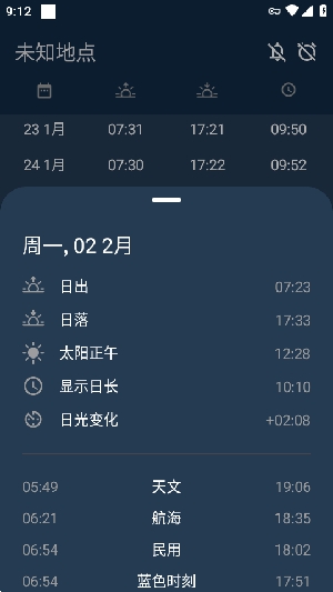 3、点开当前日期可以查看具体显示日长及各种日出时间。