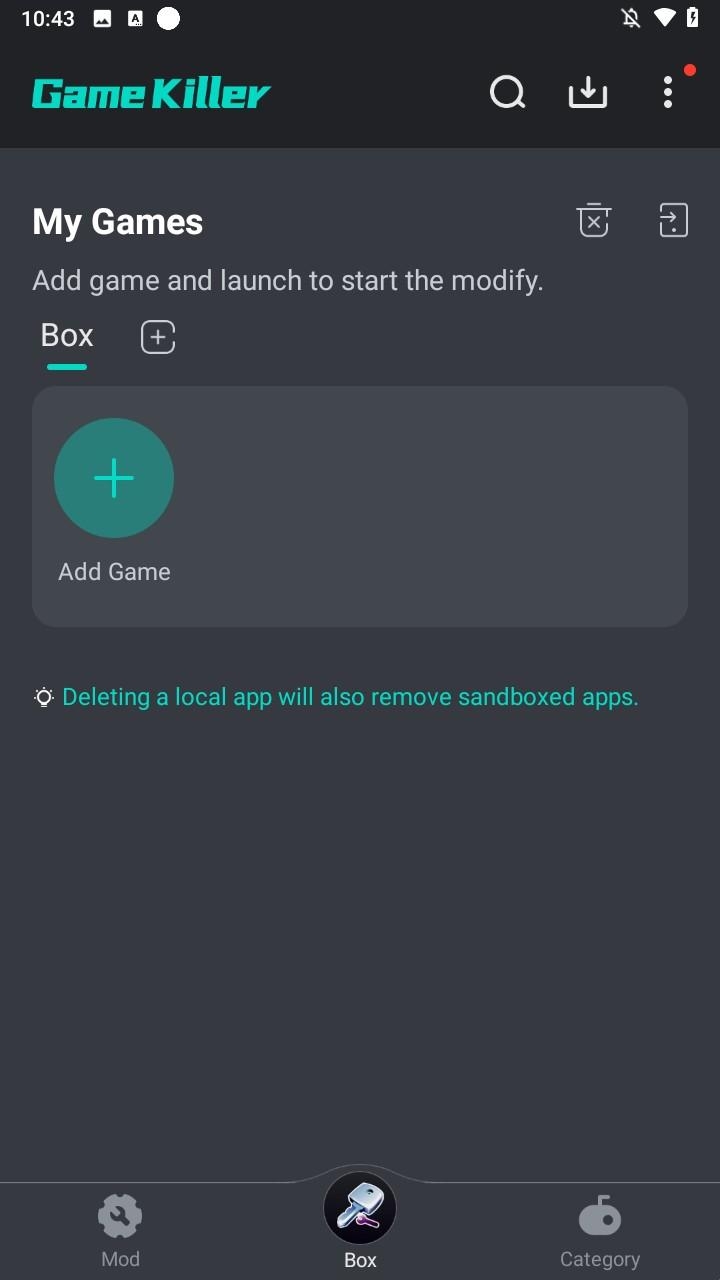 1、打开软件进入沙箱界面,点击添加游戏按钮