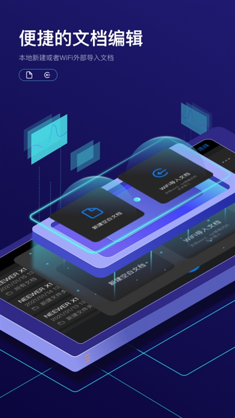 3、便捷的文档编辑功能让你轻松新建文档,通过wifi外部导入文档,让文档编辑更加轻松。