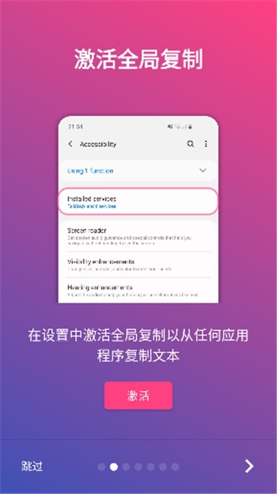 1、软件开启辅助服务激活全局复制模式就能轻在各种的应用中你想复制的文本。