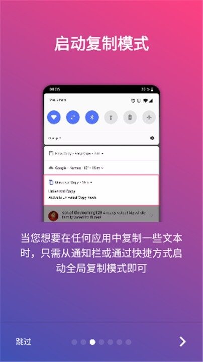 点击下面的“打开设置"按钮,或转到“设置”/“无障碍”/“全局复制”,将其先关闭再打开这会启动/重新启动服务,您将看到通知有时安卓系统(尤其是三星设备上)会自动终止无障碍服务,因此您必须手动重新启动它。