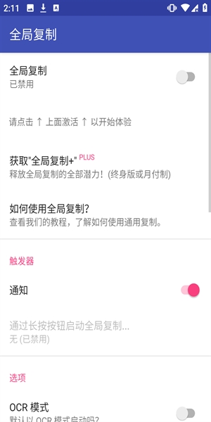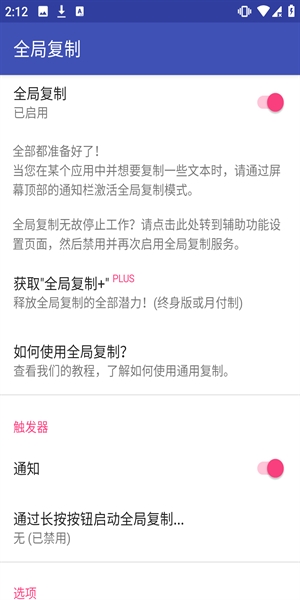 点击下面的“打开设置"按钮,或转到“设置”/“无障碍”/“全局复制”,将其先关闭再开启它会启动/重新启动服务,并且Universal Copy应该能再次工作。如果仍然无法使用,请尝试在“设置"中选择另一个触发按钮(最好使用“返回"按钮)