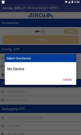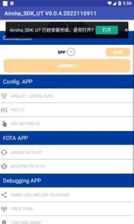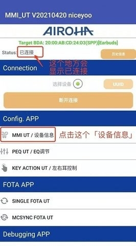 如果大家上方红框文字不是显示的「已连接」的话,是不能点击这个「设备信息」按钮的,这种情况下有两种可能,一种就是连不上这款软件,另一种就是当前连接的设备不稳定,如果是设备不稳定的话,在手机蓝牙里忽略设备,然后重新连接耳机就可以了,然后再打开软件操作第2步骤,如果还是连不上,并且顶部的「Target DBA」文字一直显示红色自提的话,那么就不是洛达芯片了~