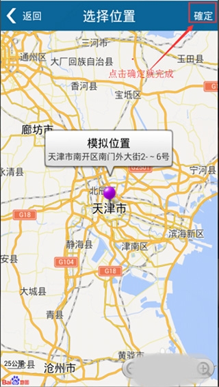 6、在地图上选择需要模拟的位置,点击确定定位。(陌陌、微信也如上操作)