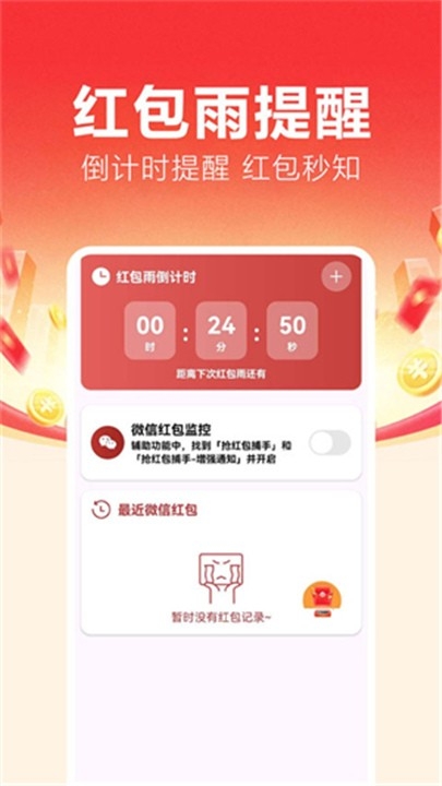 红包捕手是一款日常生活抢红包助手APP,这款软件的强大之处就在于就算你没有时时刻刻盯着手机,一旦有红包,系统机会自动帮助你抢红包解放你的双手,并且它还支持在聊天界面抢红包奥,还可以自己调节抢红包的速度,就算是自己发出的红包也能抢!有了它还怕错过任何抢红包的机会吗?