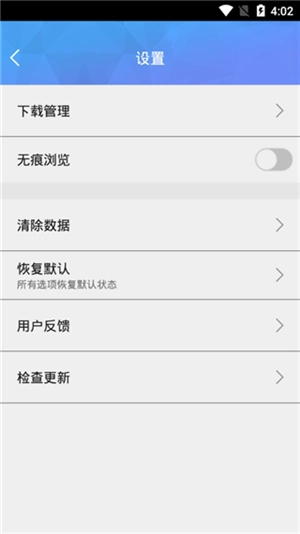 3、无痕浏览、清楚数据、恢复默认等核心功能,便捷实用。