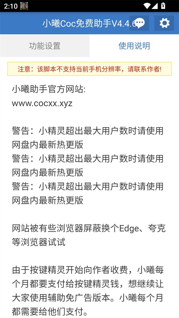 1、打开手机上的小曦COC脚本辅助软件进入到主界面。