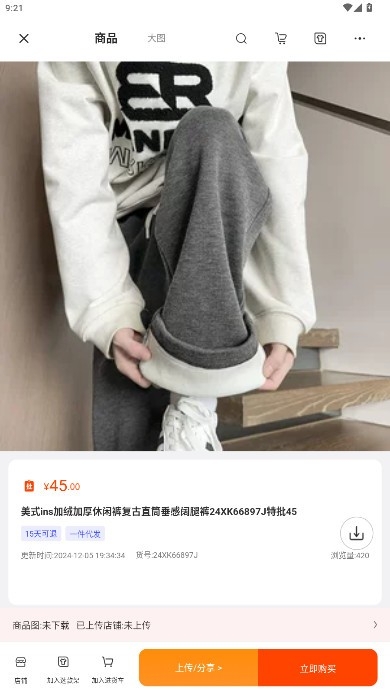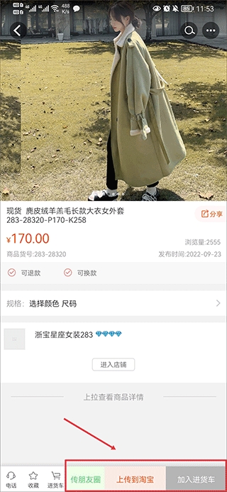 3、遇到心仪商品,可上传至淘宝店铺、朋友圈,或加入进货车购买。