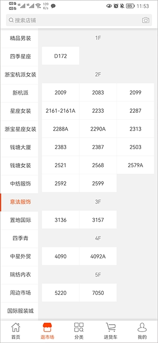 1、打开四季星座网App,在逛市场界面查找所需服装店铺。