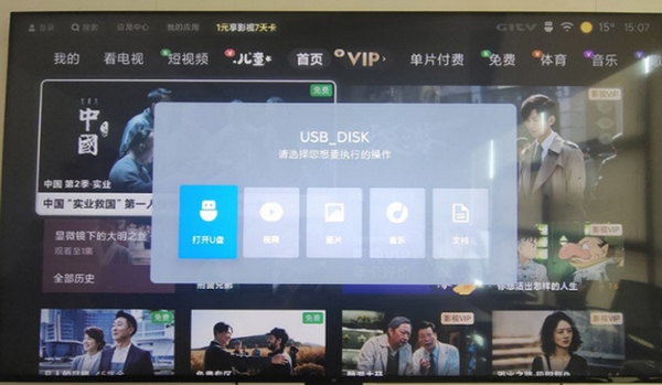 2、将下载好的安装包的u盘插到电视usb接口上,会提示检测到新的usb设备,打开它。