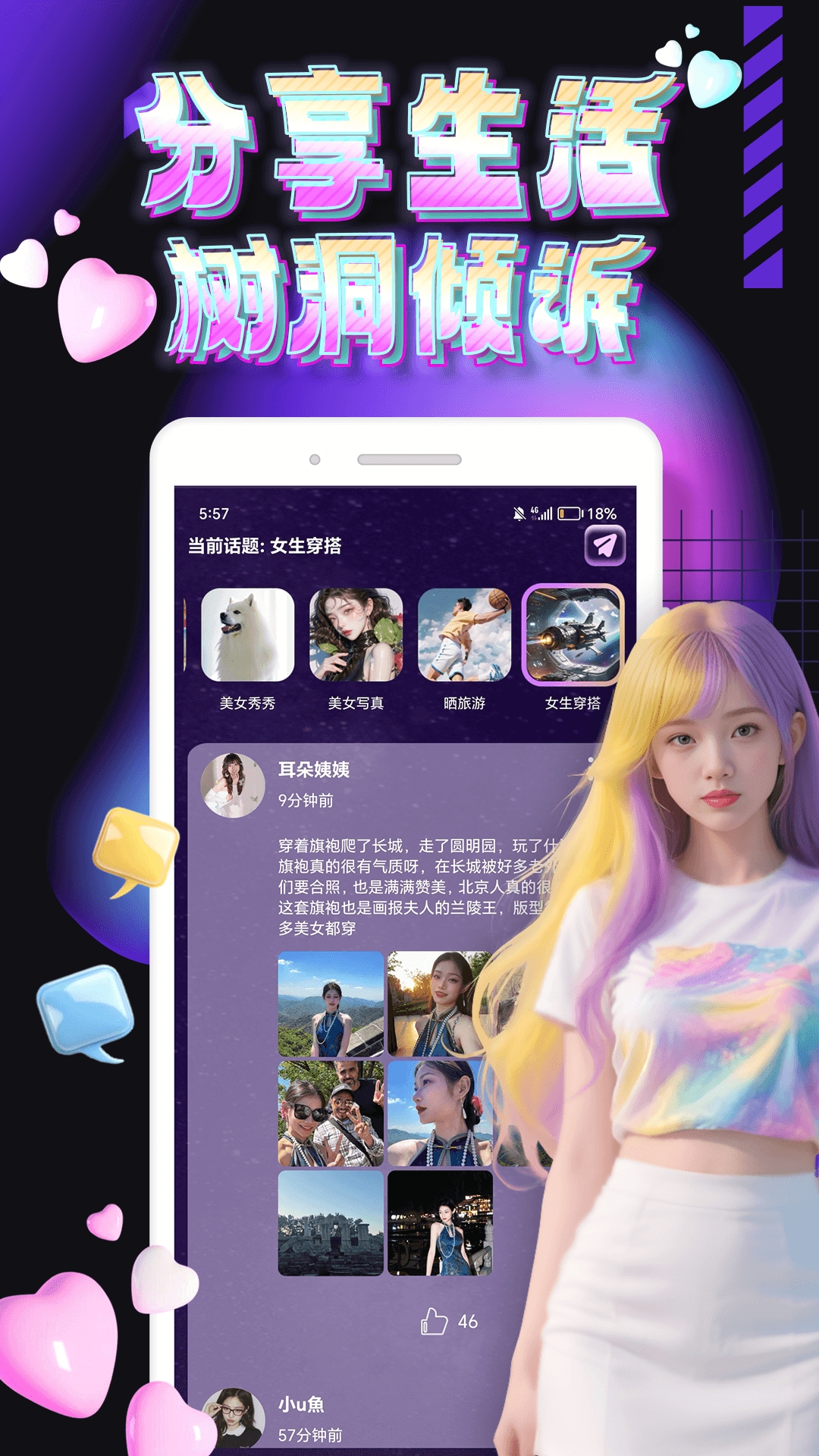 2、用户可以分享文字、图片、视频、链接等多种内容,支持点赞、评论和转发功能。