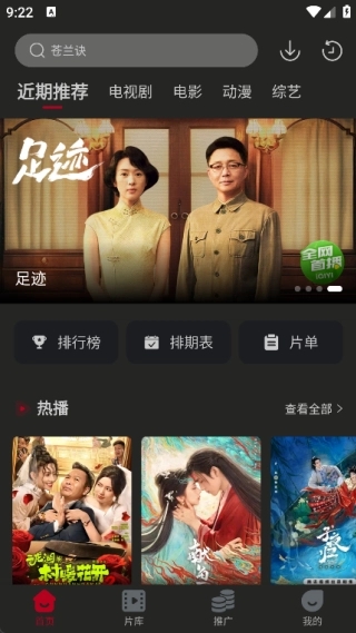 1、首页设有近期推荐、电视剧、电影、动漫、综艺等版块,其中推荐版块包含排行榜、排期表与片单内容。