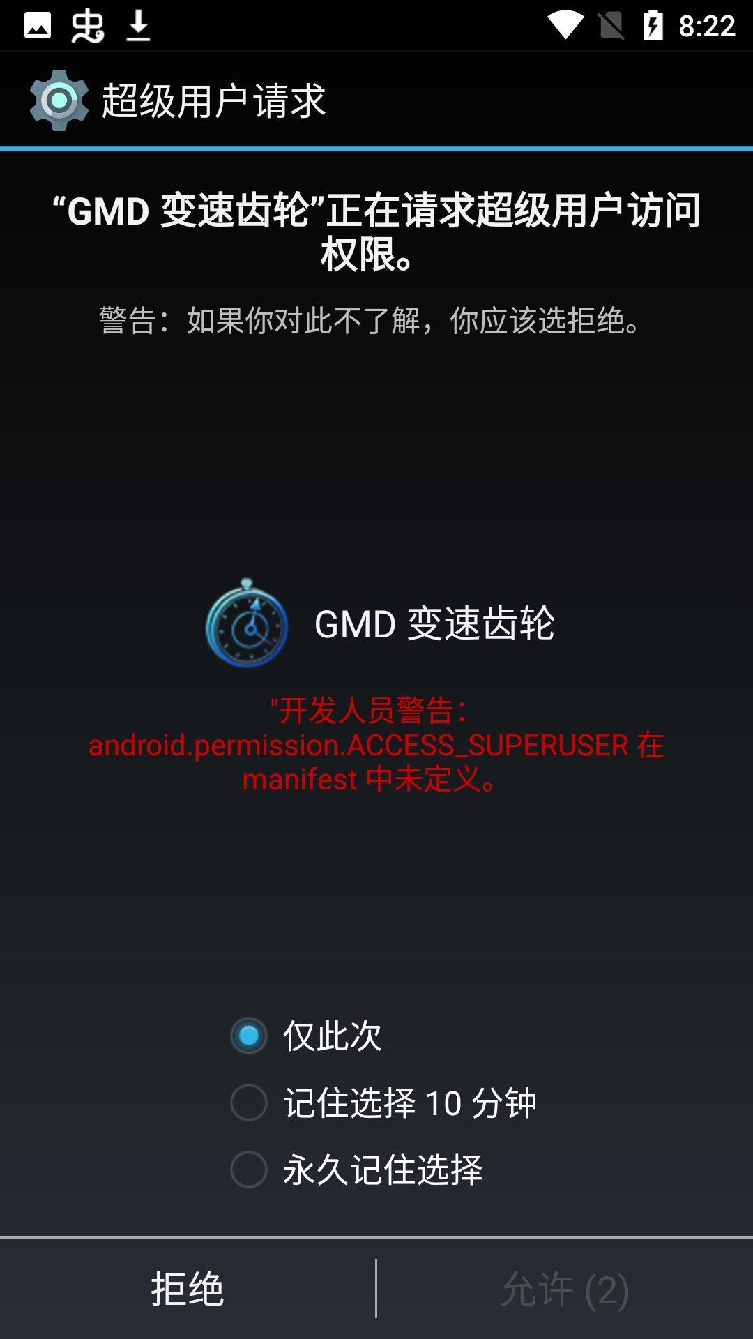2、这时该应用正在请求超级用户访问权限,你可以根据自身情况勾线以下三种选项,并点击允许。