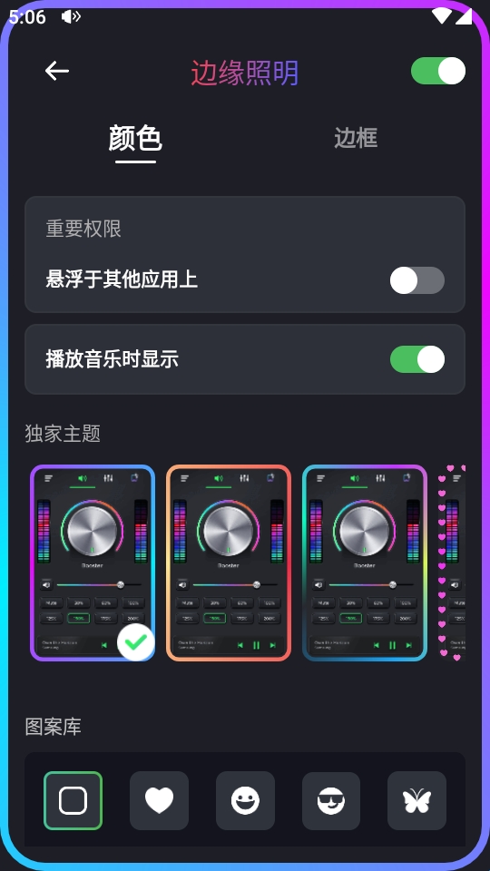 4、科技风格设计,四种主题类型,边缘照明功能和现场声谱,干净简单的页面和一键式操作。