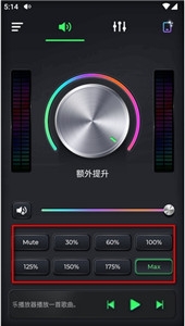 2、下方有根据音量调大相关按钮,mute是静音,后面的30%、60%、100%,125%,150%,175%和max就是音量增大的不同倍速。