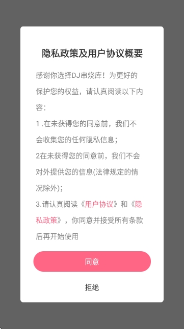 1、下载安装后打开应用,同意相关协议即可进入主界面,开启DJ串烧音乐之旅。