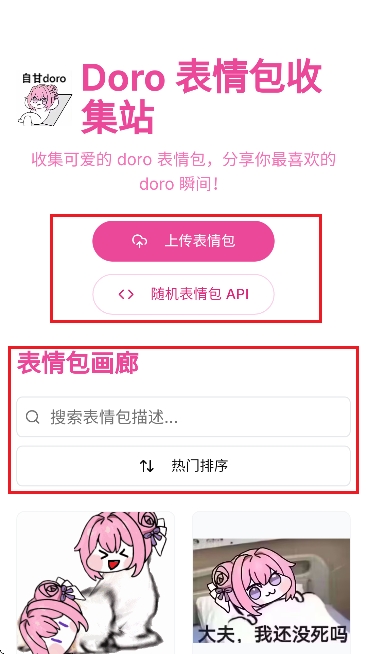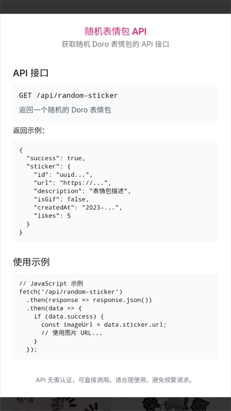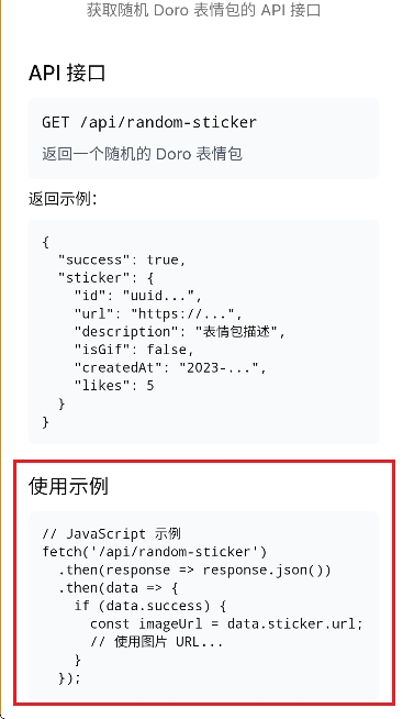 5、然后点击随机表情包API,可以获取随机Doro表情包的API接口,直接调用即可。如图所示。