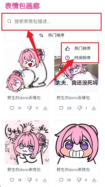 3、然后用户可以通过下方的表情包画廊的搜索功能来输入关键词首先精准搜索。还可以使用排序功能进行查找;
