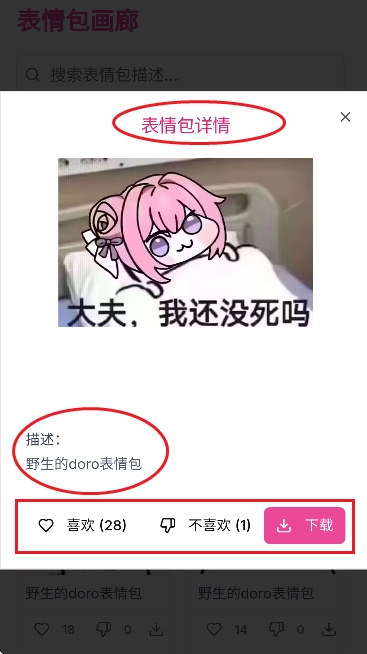 4、然后任意点开一个表情表可以查看该表情包的详情描述。而且这里可以进行喜欢,不喜欢以及下载等操作。
