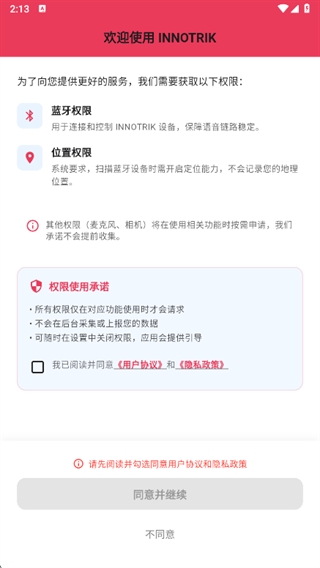 1、下载INNOTRIK app安装好之后打开它,看到如下的弹窗直接点击同意。