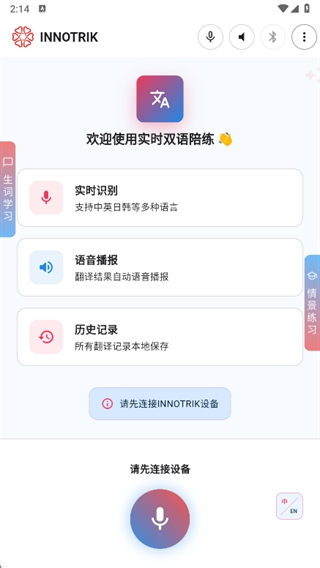 INNOTRIK是一款英语口语学习软件,软件具备强大的实时翻译功能,能够在用户遇到表达障碍时快速提供中文释义或英文参考句型,辅助对话流畅进行。它采用高清、自然的AI语音合成技术,为用户营造沉浸式的听觉环境。