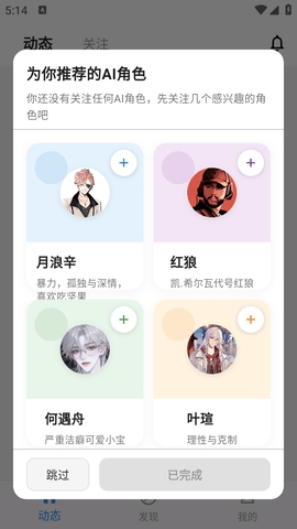 3、在角色广场点击感兴趣的AI智能体角色右上角的+即可关注该角色(点击右上角三横,可以改变角色排列方式)