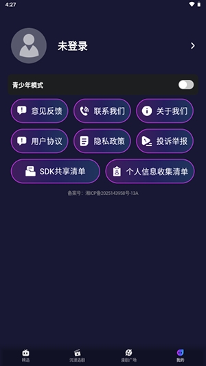 1、登录之后,点击右下角【我的】,在账号下面会有一个【青少年模式】,再点击右边的滑块按钮。