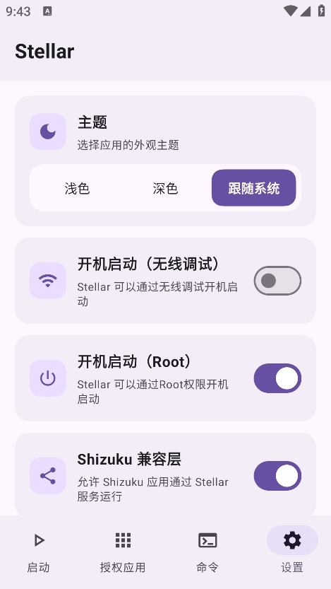 Stellar是一款集迷你安卓系统增强与应用权限管理于一体的助手工具。通过ADB无线调试权限或 Root权限使用系统级 API,软件增强了权限,优化了启动和服务,重构架构,都是Android设备终极控制中心的不二之选。