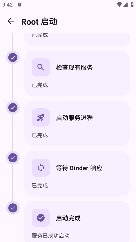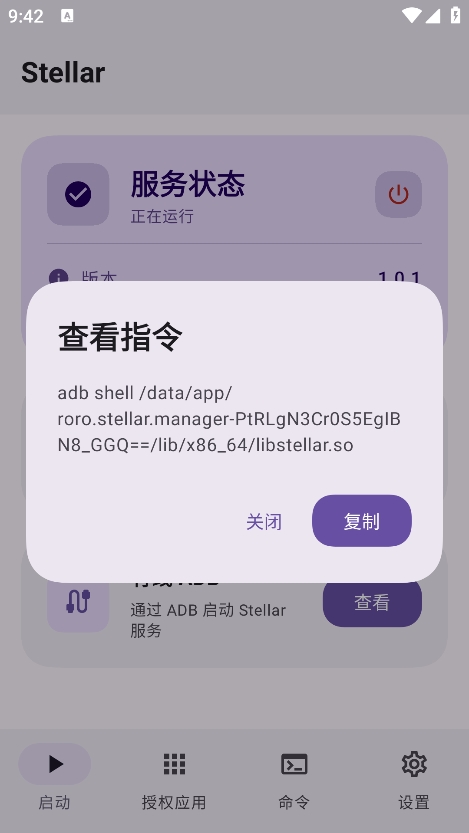 打开Stellar应用,根据界面引导选择启动模式(ADB或Root),启动成功后服务日志会显示运行状态。