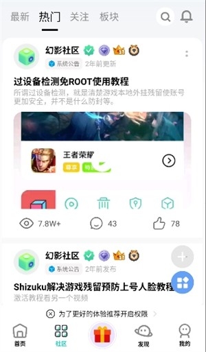 幻影社区是一款综合平台APP,可以快速加入喜欢的圈子进行聊天,提供了各种优质工具可以使用,例如修改器、玩机工具、网络搭建、游戏防闪等,支持玩家实时交流、组队互动,一站式满足游戏玩家的工具使用、资源获取与社交互动需求。