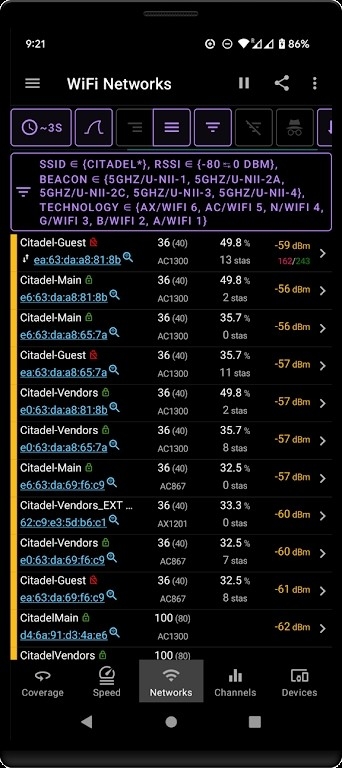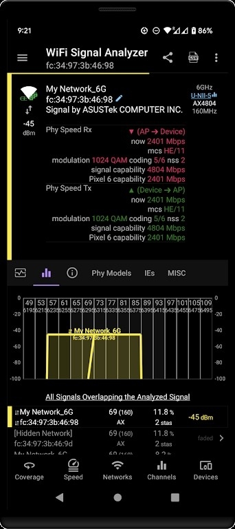 1、Wi-Fi信号扫描:实时检测周边所有2.4GHz/5GHz/6GHz频段的无线网络。