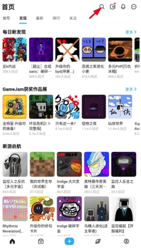 2、进入创游世界后,在主界面点击上方放大镜按钮,输入关键词进行搜索。